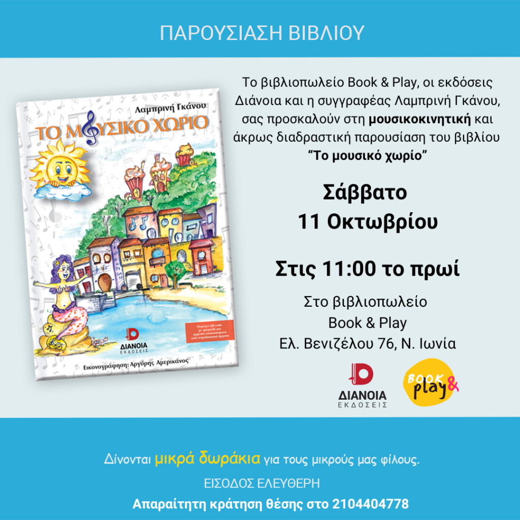 Βιβλιοπαρουσίαση με Μουσικοκινητική του βιβλίου “Το Μουσικό Χωριό” . Ελάτε σε μια διαδραστική παρουσίαση του βιβλίου της Λαμπρινής Γκάνου με διάθεση για χορό, μουσική και κίνηση. Εισοδος Ελεύθερη.