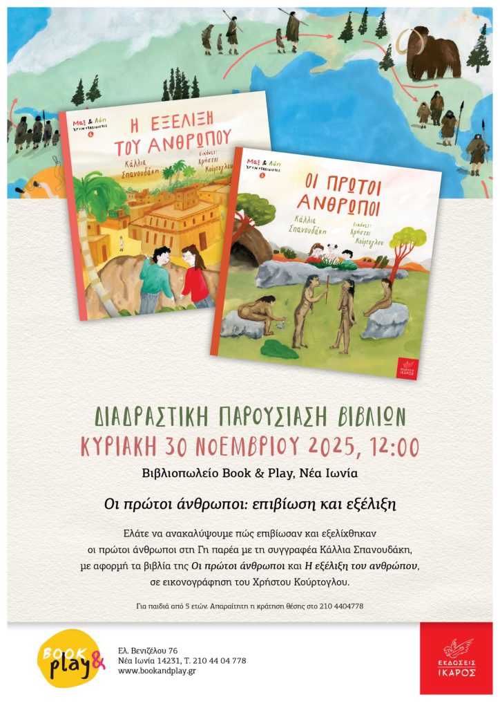 Ελάτε να ανακαλύψουμε πώς επιβίωσαν και εξελίχθηκαν οι πρώτοι άνθρωποι στη Γη με αφορμή τα βιβλία της συγγραφέας “Οι πρώτοι άνθρωποι στη Γη” και ” Η εξέλιξη του ανθρώπου” σε εικονογράφηση του Χρήστου Κούρτογλου.